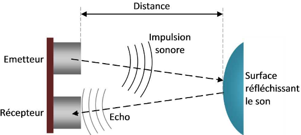 Le principe de mesure de distance avec ce type de capteur repose sur le temps que met une onde sonore émise pour aller vers un objet, rebondir puis revenir vers le récepteur.